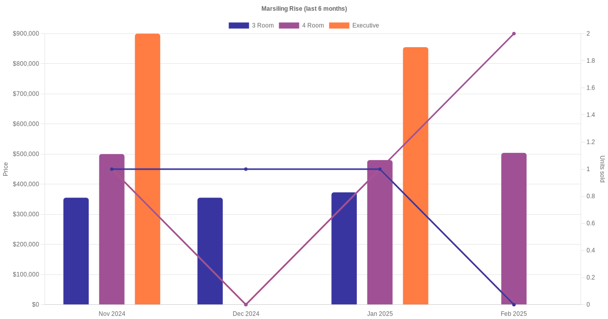 Located along Marsiling Rise are various HDB flat types including 3 room, 4 room, 5 room and executive units. Shown below is a view of the resale price and transactions trends, broken down by month, in the last 3 years.