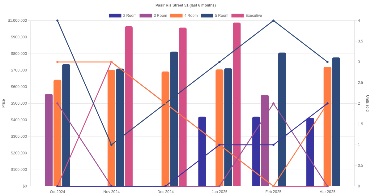 Located along Pasir Ris Street 51 are various HDB flat types including 2 room, 3 room, 4 room, 5 room and executive units. Shown below is a view of the resale price and transactions trends, broken down by month, in the last 3 years.