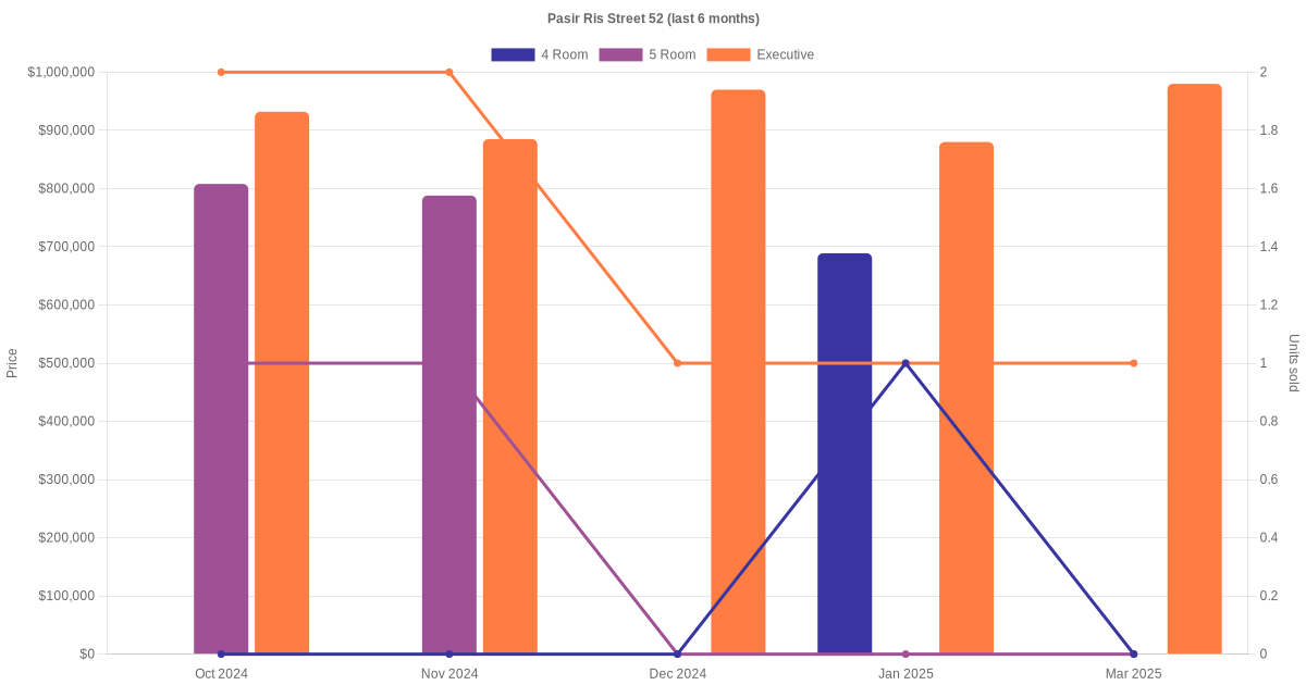 Located along Pasir Ris Street 52 are various HDB flat types including 4 room, 5 room and executive units. Shown below is a view of the resale price and transactions trends, broken down by month, in the last 3 years.