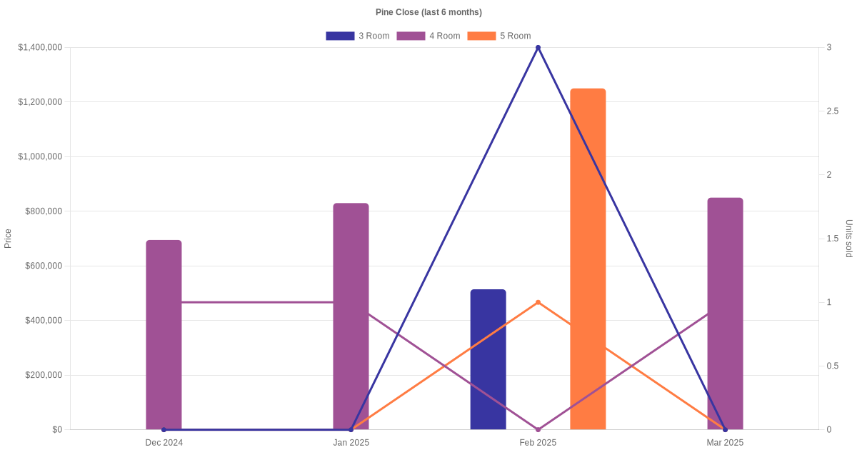 Located along Pine Close are various HDB flat types including 3 room, 4 room and 5 room units. Shown below is a view of the resale price and transactions trends, broken down by month, in the last 3 years.