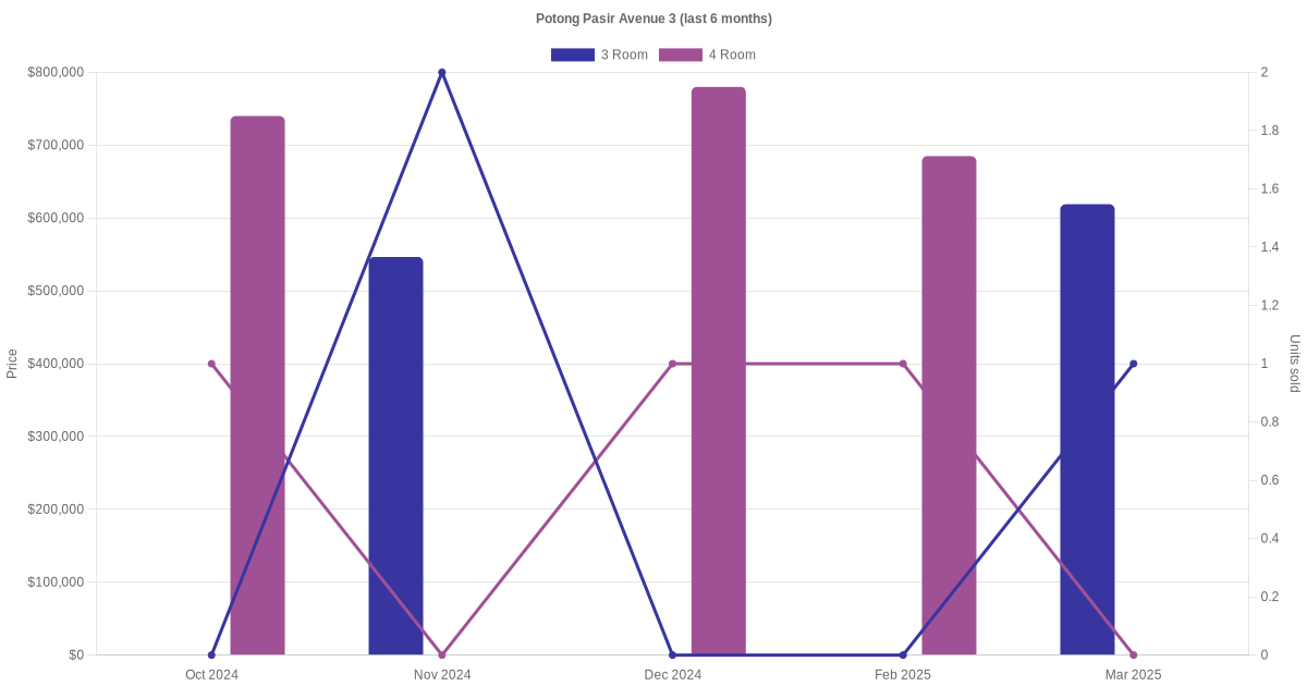 Located along Potong Pasir Avenue 3 are various HDB flat types including 3 room, 4 room and 5 room units. Shown below is a view of the resale price and transactions trends, broken down by month, in the last 3 years.