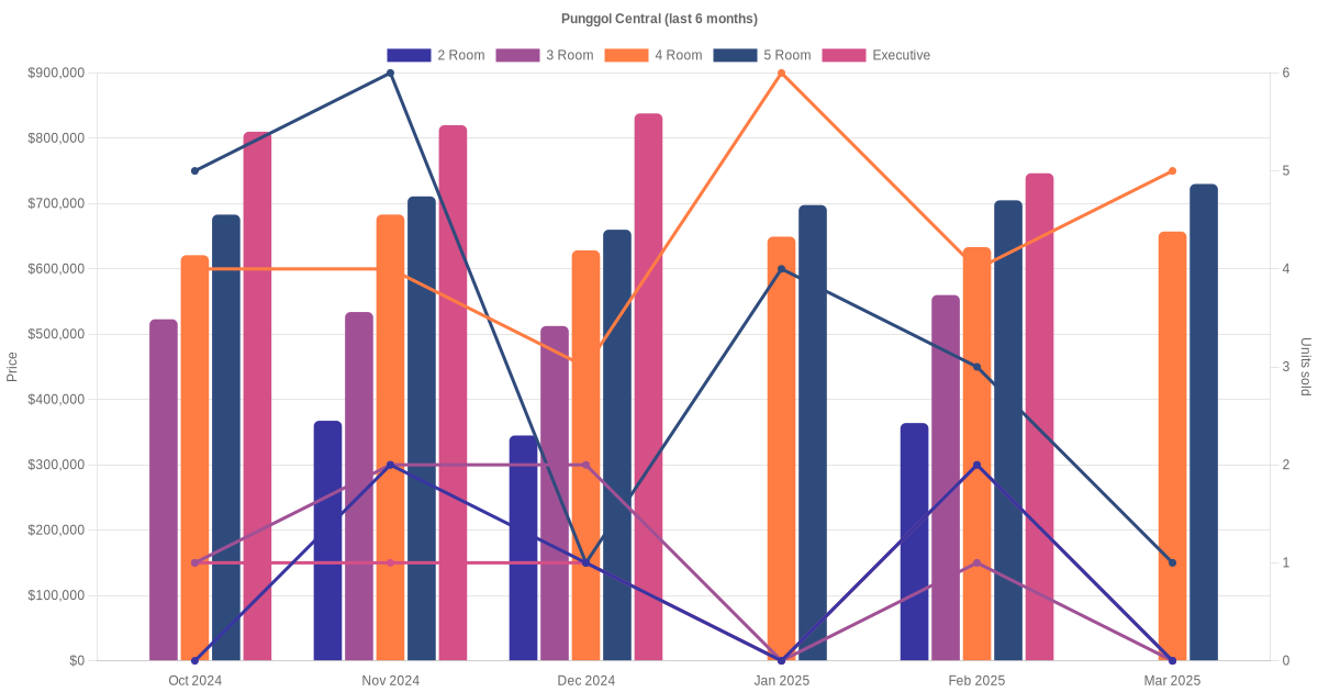 Located along Punggol Central are various HDB flat types including 2 room, 3 room, 4 room, 5 room and executive units. Shown below is a view of the resale price and transactions trends, broken down by month, in the last 3 years.