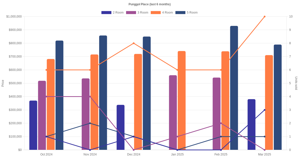 There are various HDB flat types including 2 room, 3 room, 4 room and 5 room, located along Punggol Place. Here is a quick view of the rental price and transactions trend summary, broken down by month, in the last 3 years.