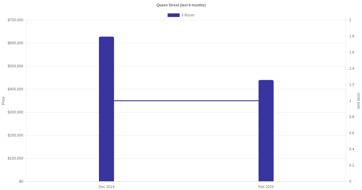 Located along Queen Street are various HDB flat types including 3 room and 4 room units. Shown below is a view of the resale price and transactions trends, broken down by month, in the last 3 years.