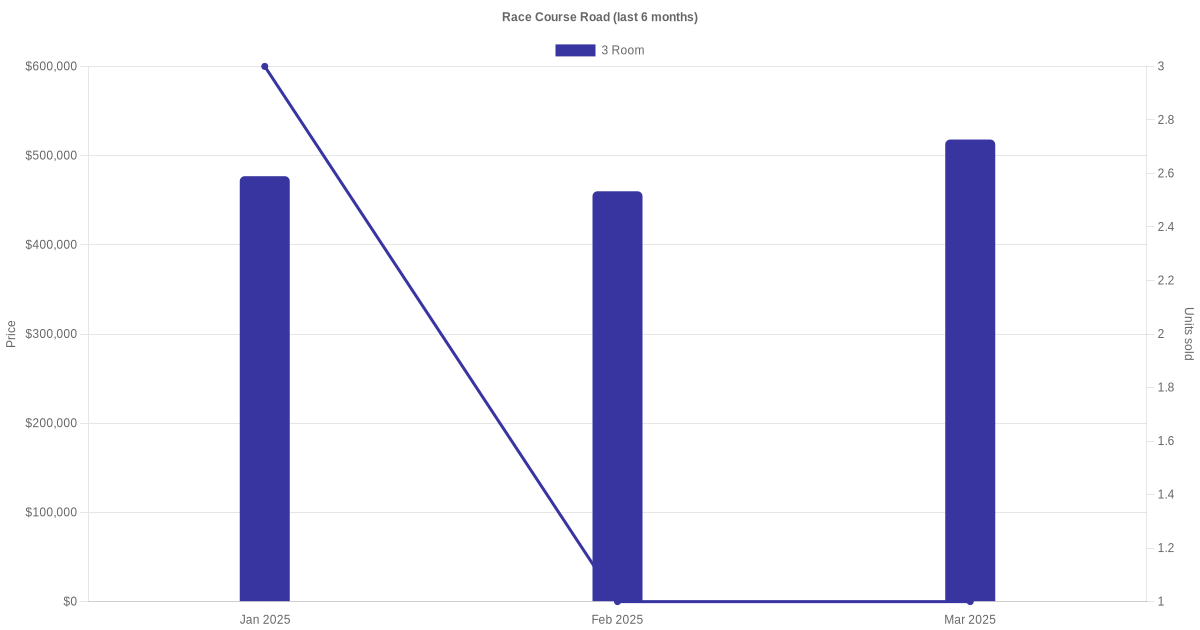 Located along Race Course Road are various HDB flat types including 3 room and 4 room units. Shown below is a view of the resale price and transactions trends, broken down by month, in the last 3 years.