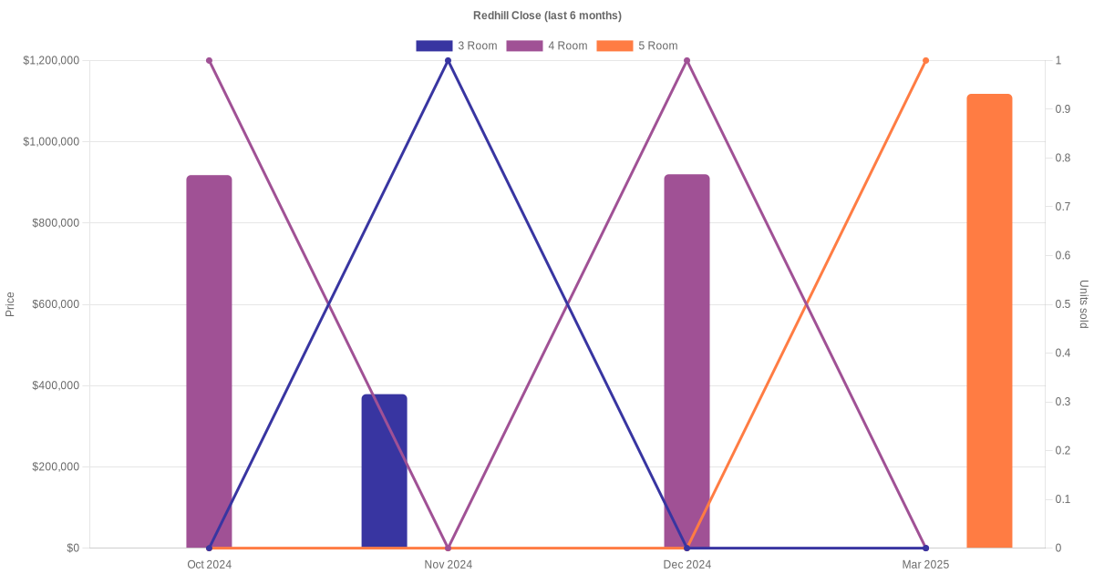 Located along Redhill Close are various HDB flat types including 3 room, 4 room and 5 room units. Shown below is a view of the resale price and transactions trends, broken down by month, in the last 3 years.