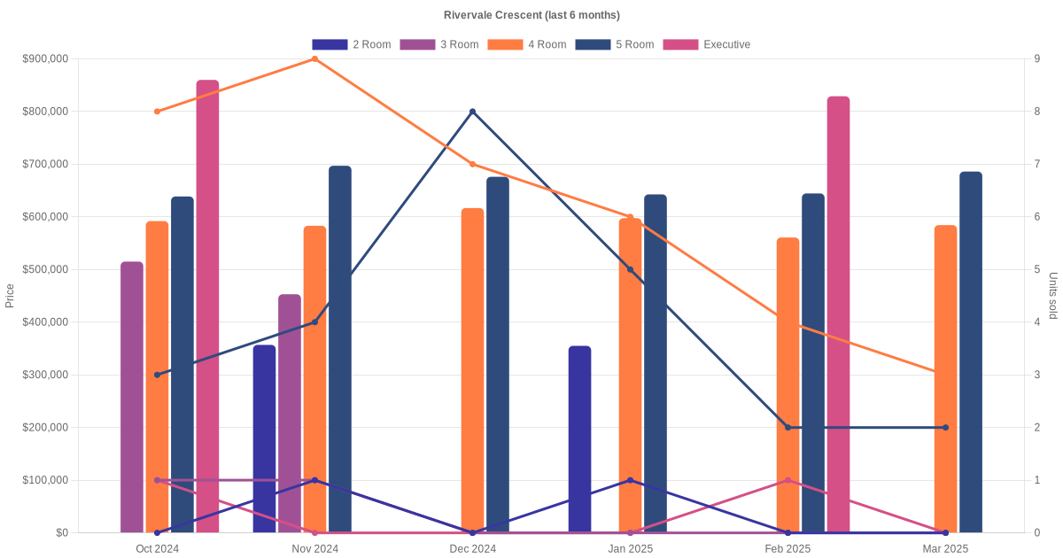 Located along Rivervale Crescent are various HDB flat types including 2 room, 3 room, 4 room, 5 room and executive units. Shown below is a view of the resale price and transactions trends, broken down by month, in the last 3 years.