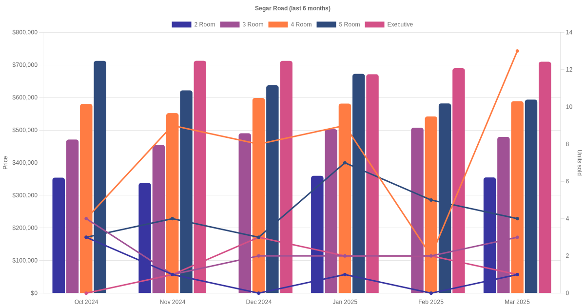 Located along Segar Road are various HDB flat types including 2 room, 3 room, 4 room, 5 room and executive units. Shown below is a view of the resale price and transactions trends, broken down by month, in the last 3 years.
