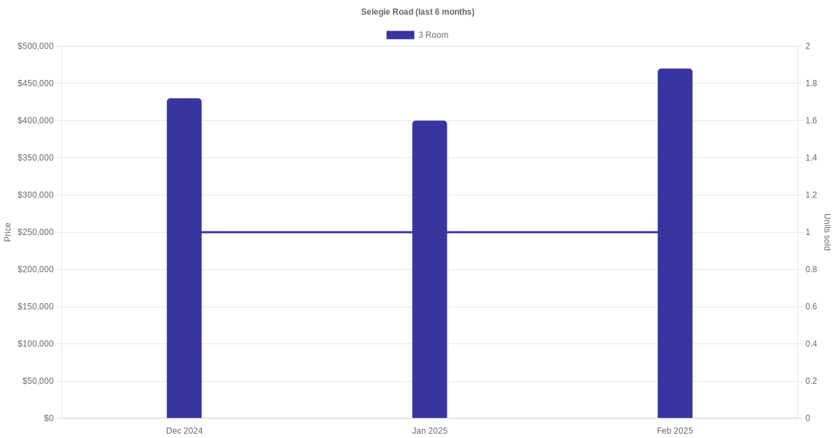 Located along Selegie Road are various HDB flat types including 2 room, 3 room and 4 room units. Shown below is a view of the resale price and transactions trends, broken down by month, in the last 3 years.