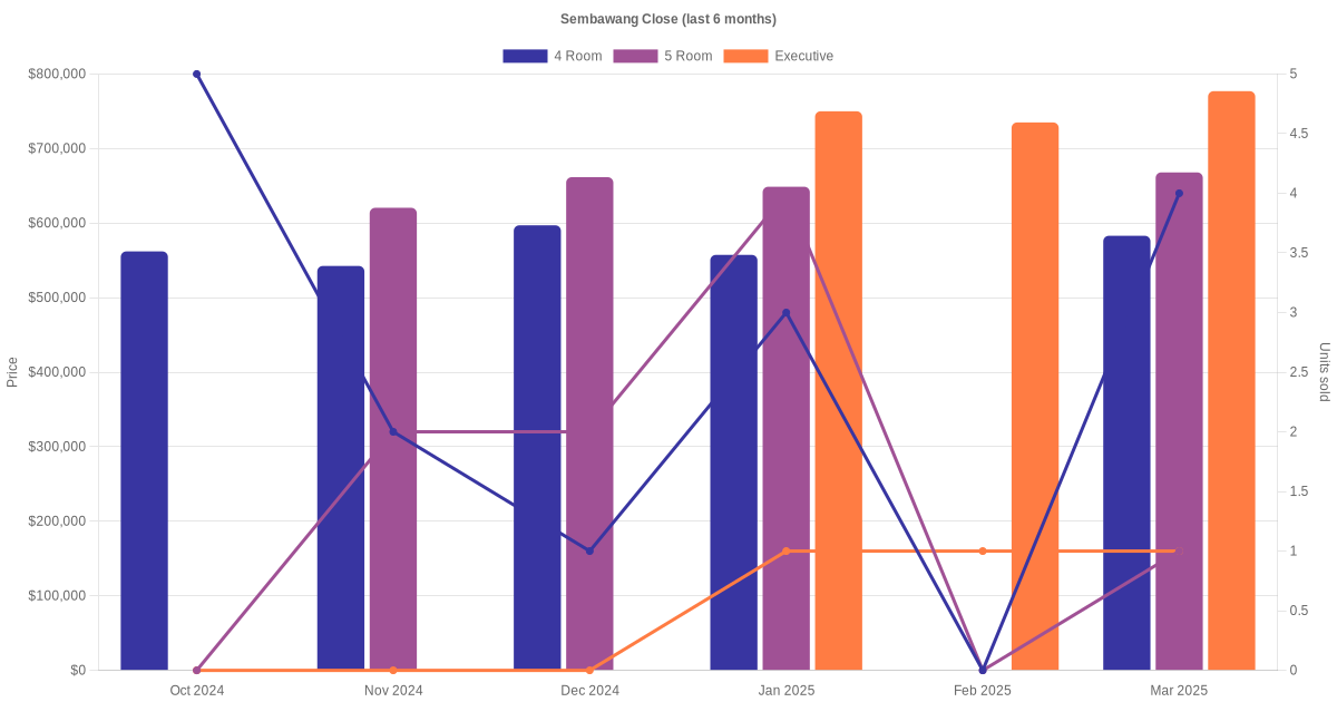 Located along Sembawang Close are various HDB flat types including 4 room, 5 room and executive units. Shown below is a view of the resale price and transactions trends, broken down by month, in the last 3 years.