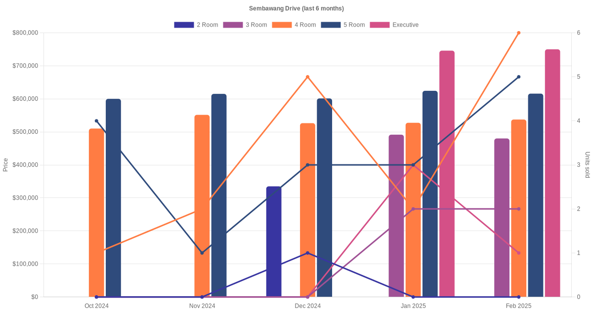 Located along Sembawang Drive are various HDB flat types including 2 room, 3 room, 4 room, 5 room and executive units. Shown below is a view of the resale price and transactions trends, broken down by month, in the last 3 years.
