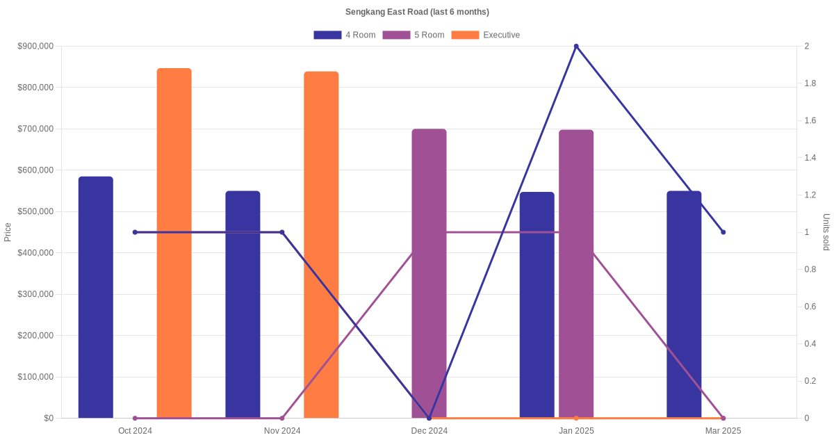 Located along Sengkang East Road are various HDB flat types including 4 room, 5 room and executive units. Shown below is a view of the resale price and transactions trends, broken down by month, in the last 3 years.