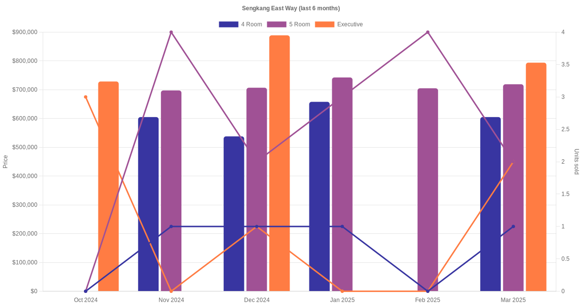 Located along Sengkang East Way are various HDB flat types including 4 room, 5 room and executive units. Shown below is a view of the resale price and transactions trends, broken down by month, in the last 3 years.