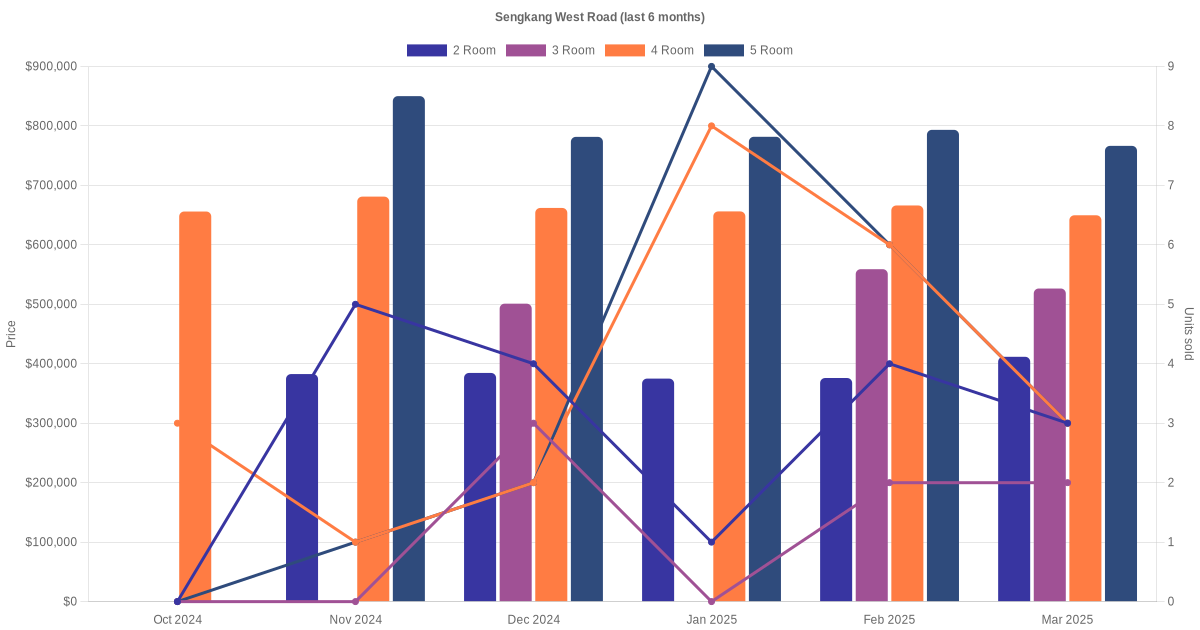 Located along Sengkang West Road are various HDB flat types including 2 room, 3 room, 4 room and 5 room units. Shown below is a view of the resale price and transactions trends, broken down by month, in the last 3 years.
