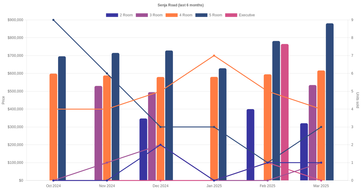 Located along Senja Road are various HDB flat types including 2 room, 3 room, 4 room, 5 room and executive units. Shown below is a view of the resale price and transactions trends, broken down by month, in the last 3 years.