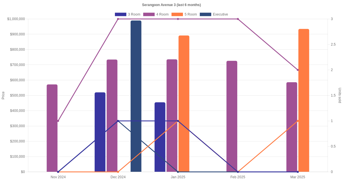 Located along Serangoon Avenue 3 are various HDB flat types including 3 room, 4 room, 5 room and executive units. Shown below is a view of the resale price and transactions trends, broken down by month, in the last 3 years.