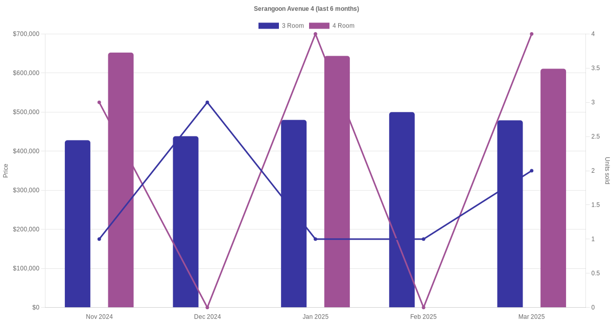 Located along Serangoon Avenue 4 are various HDB flat types including 3 room, 4 room and 5 room units. Shown below is a view of the resale price and transactions trends, broken down by month, in the last 3 years.