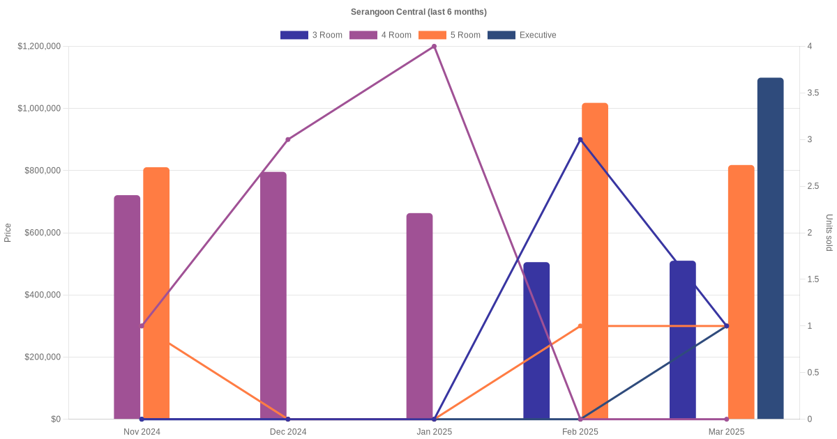 Located along Serangoon Central are various HDB flat types including 3 room, 4 room, 5 room and executive units. Shown below is a view of the resale price and transactions trends, broken down by month, in the last 3 years.