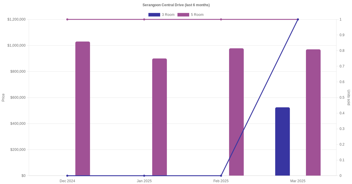 Located along Serangoon Central Drive are various HDB flat types including 3 room, 4 room and 5 room units. Shown below is a view of the resale price and transactions trends, broken down by month, in the last 3 years.