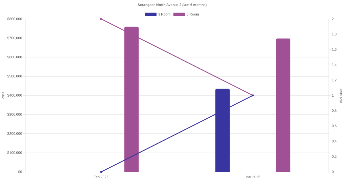 Located along Serangoon North Avenue 2 are various HDB flat types including 3 room, 4 room, 5 room and executive units. Shown below is a view of the resale price and transactions trends, broken down by month, in the last 3 years.