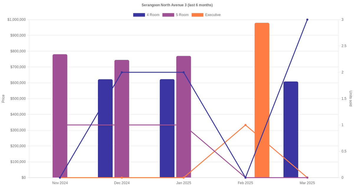 Located along Serangoon North Avenue 3 are various HDB flat types including 4 room, 5 room and executive units. Shown below is a view of the resale price and transactions trends, broken down by month, in the last 3 years.