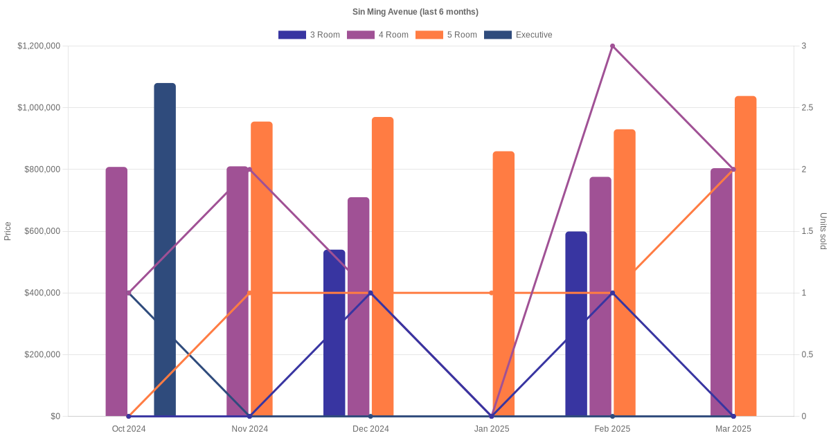Located along Sin Ming Avenue are various HDB flat types including 3 room, 4 room, 5 room and executive units. Shown below is a view of the resale price and transactions trends, broken down by month, in the last 3 years.