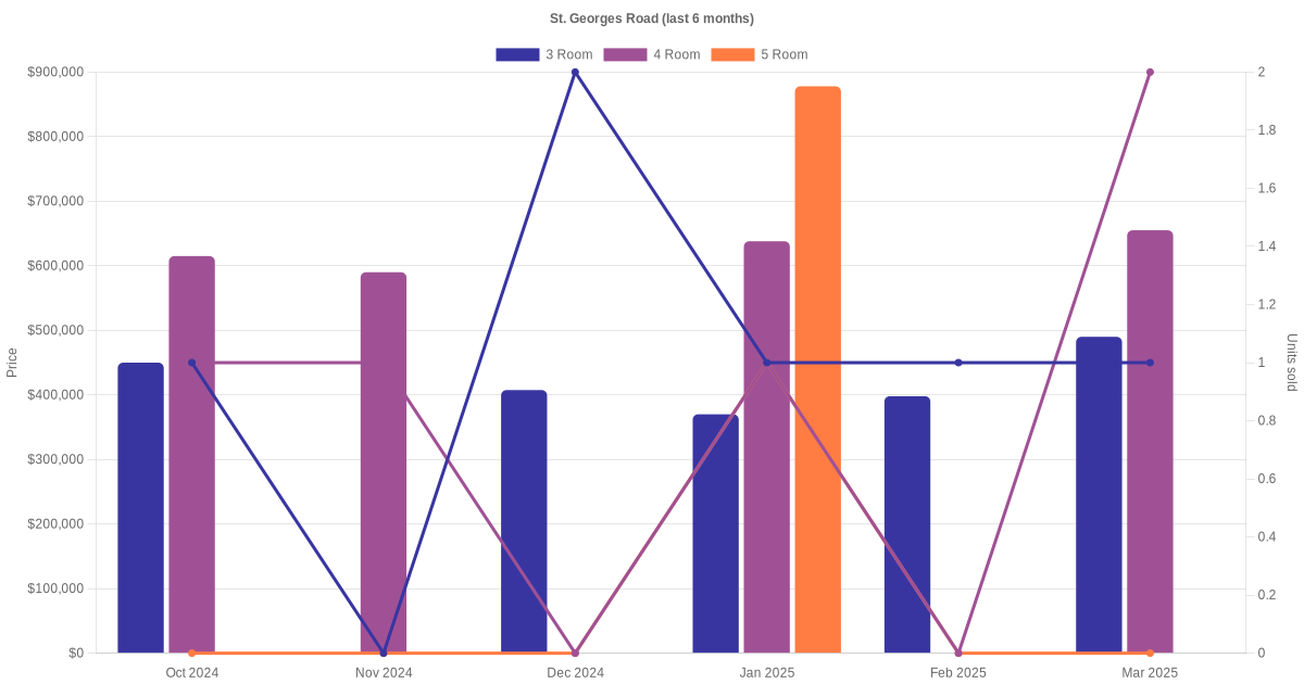 Located along St. George's Road are various HDB flat types including 3 room, 4 room and 5 room units. Shown below is a view of the resale price and transactions trends, broken down by month, in the last 3 years.