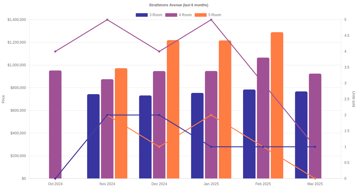 Located along Strathmore Avenue are various HDB flat types including 3 room, 4 room and 5 room units. Shown below is a view of the resale price and transactions trends, broken down by month, in the last 3 years.
