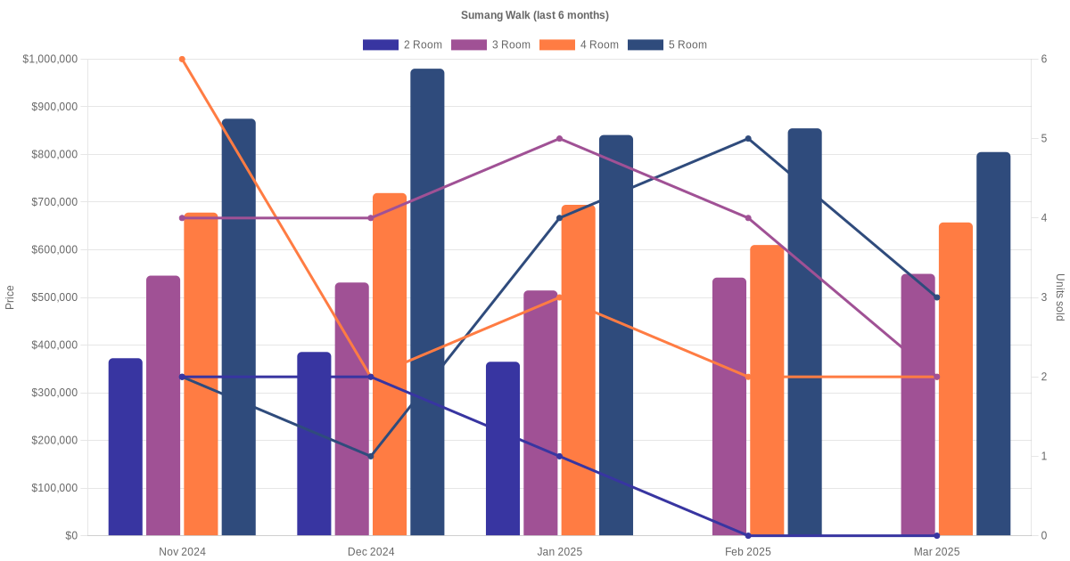 Located along Sumang Walk are various HDB flat types including 2 room, 3 room, 4 room and 5 room units. Shown below is a view of the resale price and transactions trends, broken down by month, in the last 3 years.