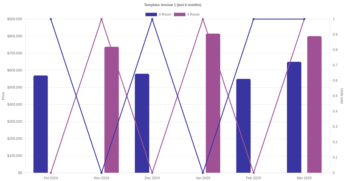 Located along Tampines Avenue 1 are various HDB flat types including 3 room and 4 room units. Shown below is a view of the resale price and transactions trends, broken down by month, in the last 3 years.