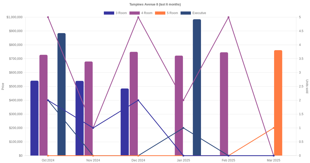 Located along Tampines Avenue 8 are various HDB flat types including 3 room, 4 room, 5 room and executive units. Shown below is a view of the resale price and transactions trends, broken down by month, in the last 3 years.