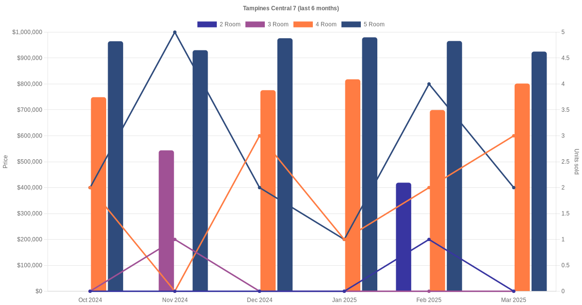 Located along Tampines Central 7 are various HDB flat types including 2 room, 3 room, 4 room and 5 room units. Shown below is a view of the resale price and transactions trends, broken down by month, in the last 3 years.