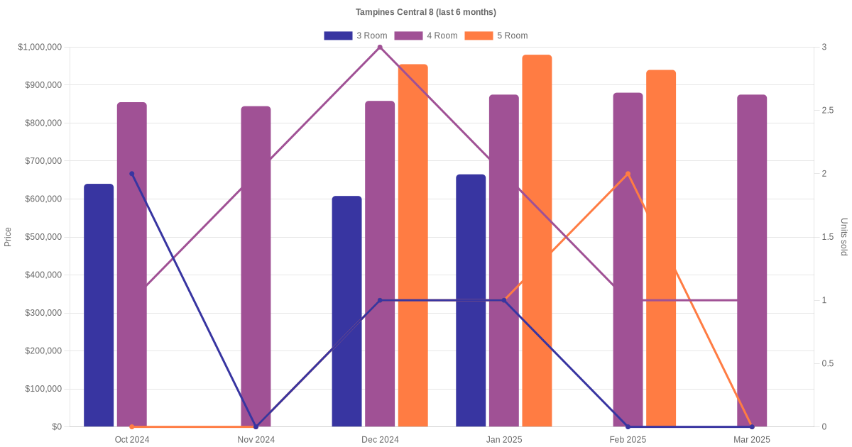 Located along Tampines Central 8 are various HDB flat types including 3 room, 4 room and 5 room units. Shown below is a view of the resale price and transactions trends, broken down by month, in the last 3 years.