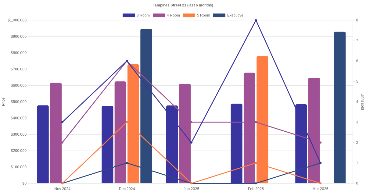 Located along Tampines Street 21 are various HDB flat types including 3 room, 4 room, 5 room and executive units. Shown below is a view of the resale price and transactions trends, broken down by month, in the last 3 years.