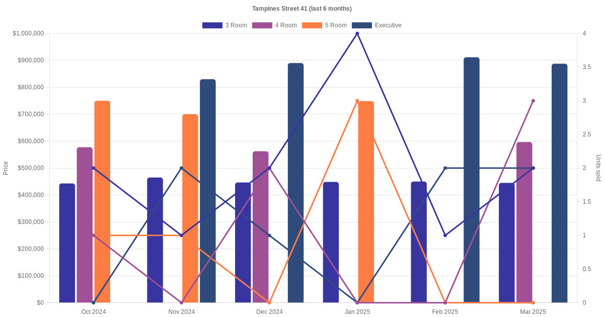 Located along Tampines Street 41 are various HDB flat types including 3 room, 4 room, 5 room and executive units. Shown below is a view of the resale price and transactions trends, broken down by month, in the last 3 years.