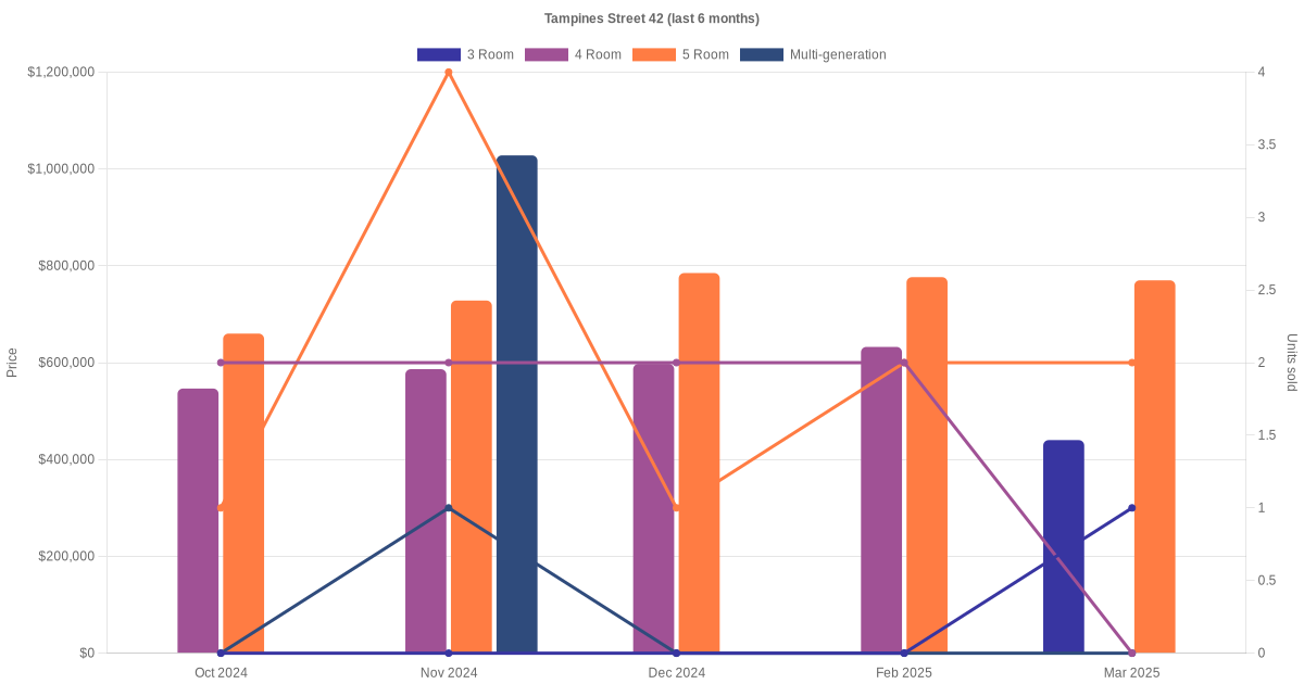 Located along Tampines Street 42 are various HDB flat types including 3 room, 4 room, 5 room and multi-generation units. Shown below is a view of the resale price and transactions trends, broken down by month, in the last 3 years.