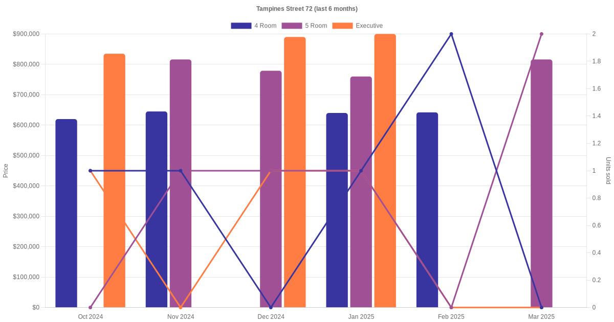 Located along Tampines Street 72 are various HDB flat types including 4 room, 5 room and executive units. Shown below is a view of the resale price and transactions trends, broken down by month, in the last 3 years.