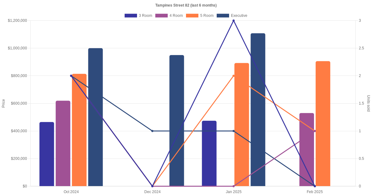 Located along Tampines Street 82 are various HDB flat types including 3 room, 4 room, 5 room and executive units. Shown below is a view of the resale price and transactions trends, broken down by month, in the last 3 years.