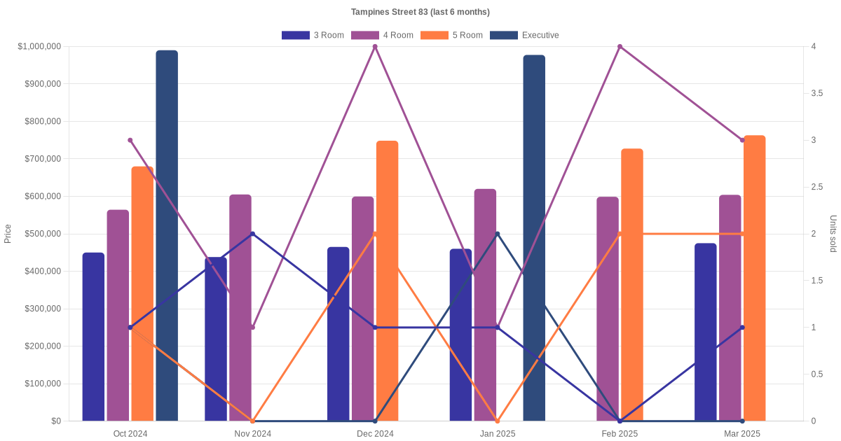 Located along Tampines Street 83 are various HDB flat types including 3 room, 4 room, 5 room and executive units. Shown below is a view of the resale price and transactions trends, broken down by month, in the last 3 years.