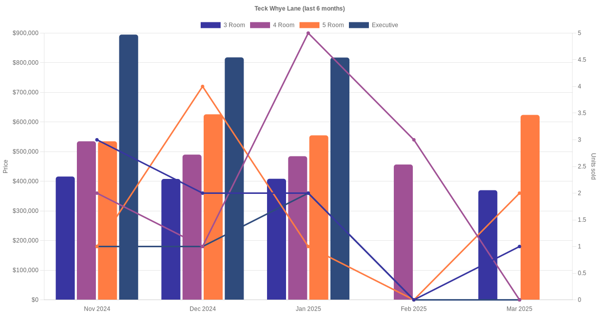 Located along Teck Whye Lane are various HDB flat types including 3 room, 4 room, 5 room and executive units. Shown below is a view of the resale price and transactions trends, broken down by month, in the last 3 years.