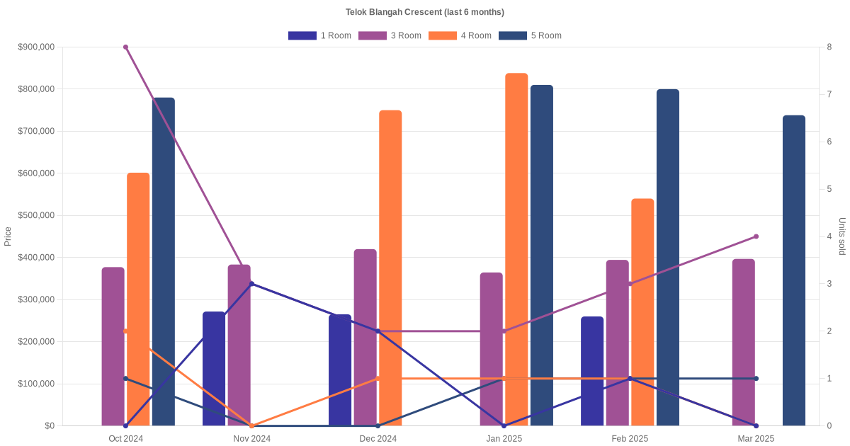 Located along Telok Blangah Crescent are various HDB flat types including 1 room, 3 room, 4 room and 5 room units. Shown below is a view of the resale price and transactions trends, broken down by month, in the last 3 years.