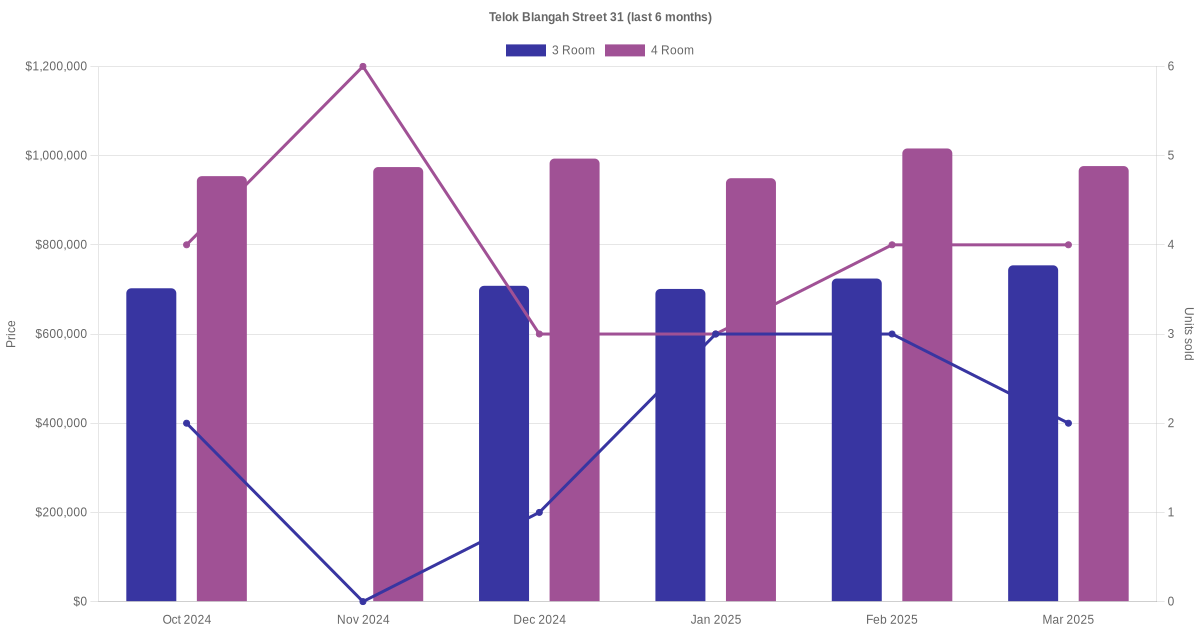 Located along Telok Blangah Street 31 are various HDB flat types including 3 room and 4 room units. Shown below is a view of the resale price and transactions trends, broken down by month, in the last 3 years.