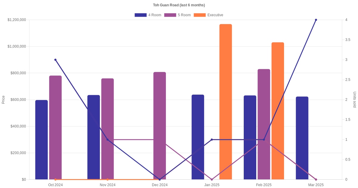 Located along Toh Guan Road are various HDB flat types including 4 room, 5 room and executive units. Shown below is a view of the resale price and transactions trends, broken down by month, in the last 3 years.