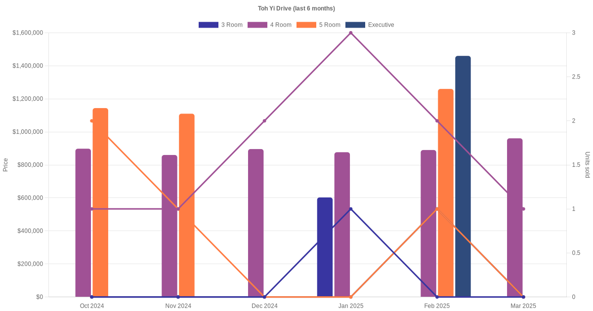 Located along Toh Yi Drive are various HDB flat types including 3 room, 4 room, 5 room and executive units. Shown below is a view of the resale price and transactions trends, broken down by month, in the last 3 years.