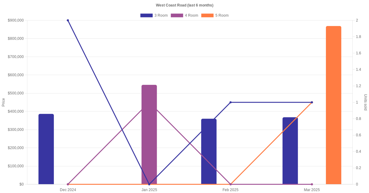 Located along West Coast Road are various HDB flat types including 3 room, 4 room and 5 room units. Shown below is a view of the resale price and transactions trends, broken down by month, in the last 3 years.