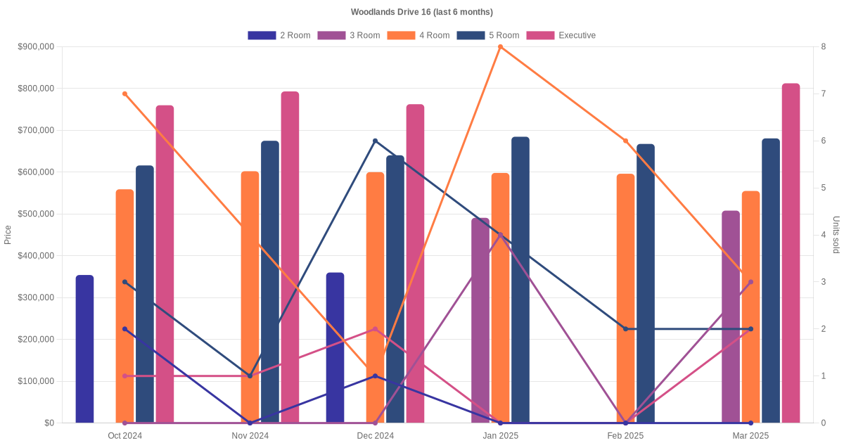 Located along Woodlands Drive 16 are various HDB flat types including 2 room, 3 room, 4 room, 5 room and executive units. Shown below is a view of the resale price and transactions trends, broken down by month, in the last 3 years.