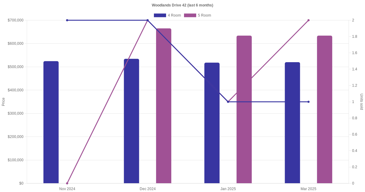 Located along Woodlands Drive 42 are various HDB flat types including 4 room and 5 room units. Shown below is a view of the resale price and transactions trends, broken down by month, in the last 3 years.
