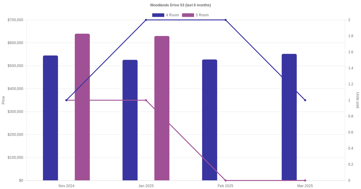 Located along Woodlands Drive 53 are various HDB flat types including 4 room and 5 room units. Shown below is a view of the resale price and transactions trends, broken down by month, in the last 3 years.
