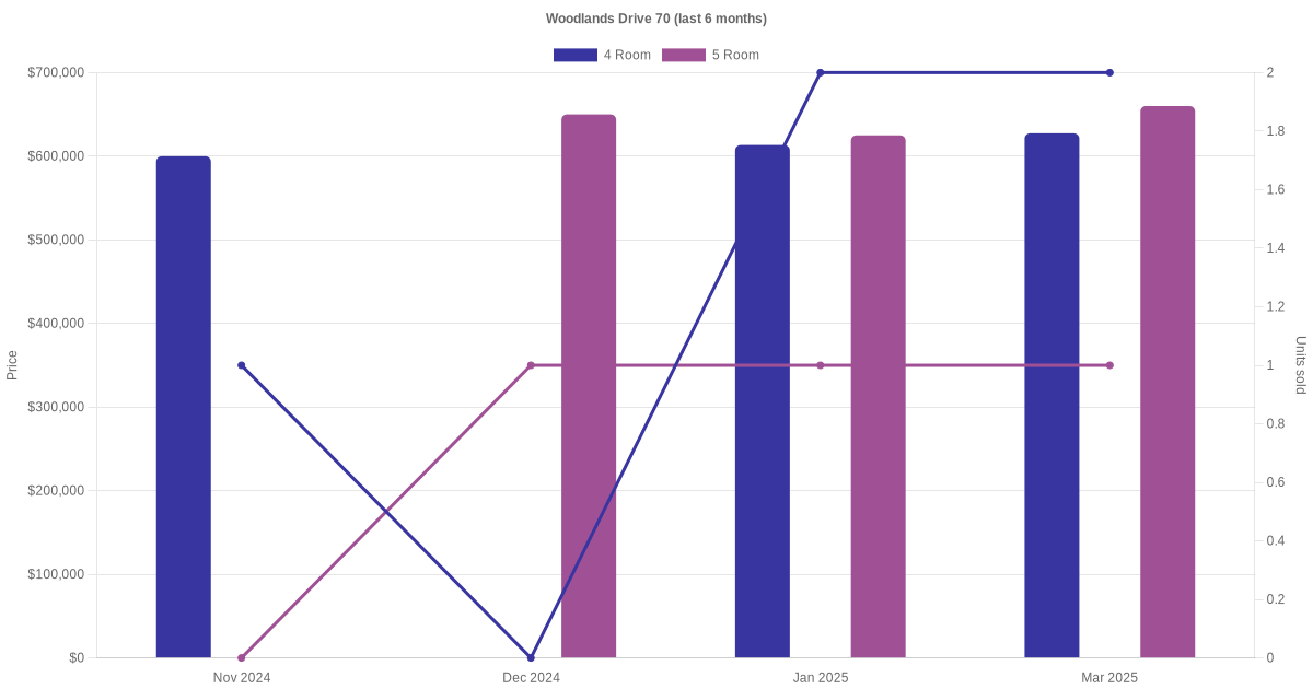 Located along Woodlands Drive 70 are various HDB flat types including 3 room, 4 room and 5 room units. Shown below is a view of the resale price and transactions trends, broken down by month, in the last 3 years.