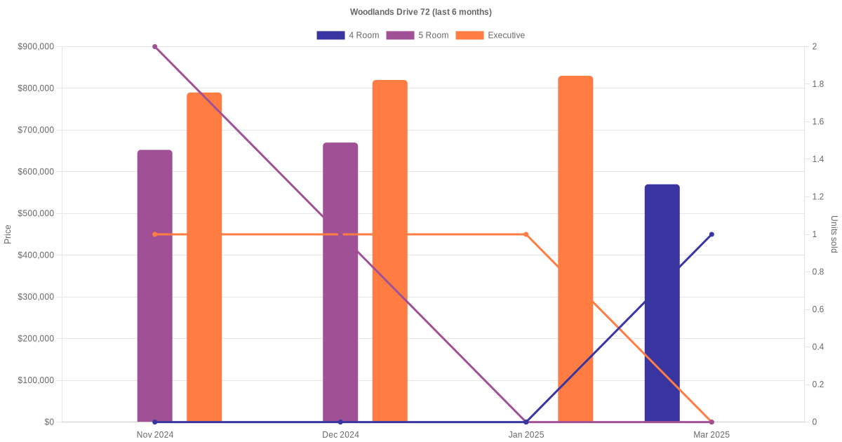 Located along Woodlands Drive 72 are various HDB flat types including 4 room, 5 room and executive units. Shown below is a view of the resale price and transactions trends, broken down by month, in the last 3 years.
